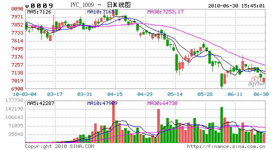 月度第二周的6月7日,PVC再度跳空低開,明顯放量下跌,日內跌幅達4.41%。因美國5月份就業數據令人失望,且歐元兌美元跌至四年低點,紐約商業交易所(NYMEX)原油期貨4日下跌4.2%。受原油繼續大幅下滑及終端用戶需求基本銷聲匿跡影響,亞洲乙烯繼續大跌。PVC現貨市場需求補貨能力仍較差,盡管貨源量一般,但不穩定心態下的調整操作仍未間斷,市場觀望氣氛明顯,實際成交量非常有限。