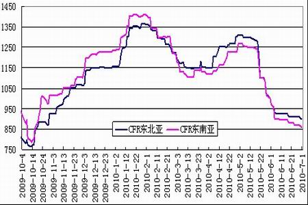 年初,受中國及印尼乙烯衍生品市場開工降低的影響,乙烯供應量略顯增加,盡管如此,市場仍然維持供應緊張局面,至1月中旬亞洲乙烯價格較去年年底已上漲近200美元/噸。但隨著價格的走高,終端用戶的利潤率不斷縮小,開工逐漸降低,市場漲速放緩。1月底,隨著9000噸遠洋現貨的抵達,市場商談氣氛迅速改變,亞洲乙烯價格自高位開始回落。此后,由于來自中東地區乙烯現貨供應量持續上升,大量涌入的遠洋報盤彌補了近洋貨源的不足,而中國市場在春節期間買氣不足,市場需求大幅減少,亞洲乙烯連續下滑,價格回落至09年年末的水平。3月份起由于日本和韓國方面計劃和意外停車的原因,市場供應相對緊張,價格再度攀升,但多數終端用戶備貨充足,成交表現不佳,亞洲乙烯市場在高位陷入僵持。此后前期停車的裝置陸續重啟,伊朗貨源數量持續增加,同時國際原油連續下跌,亞洲乙烯價格自1250美元上方大幅下挫至950美元下方。此后由于多數裂解裝置開工均在滿負荷,現貨庫存壓力逐漸增大,而終端用戶需求表現疲弱,供需矛盾持續升溫,亞洲乙烯仍然延續跌勢。但原油價格重回高位,部分裂解裝置開工率計劃下調,后期亞洲乙烯市場有望止跌企穩。