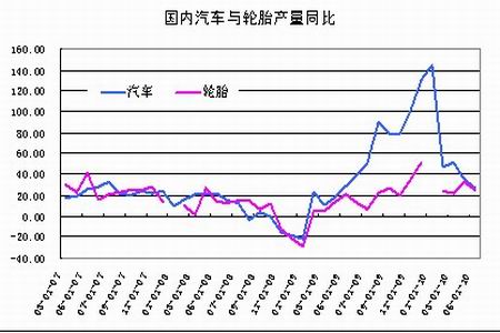 圖為國內汽車與輪胎產量同比走勢圖。(圖片來源:中信建投期貨)