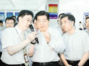 9日上午,賈慶林主席來到東莞宏威數碼機械有限公司。公司行政總裁范繼良向賈慶林主席介紹,他們的主要產品是具有知識產權的DVDR光盤生產線、BD藍光光盤生產線等,2009年,他們又建成了OLED示范性生產線和薄膜太陽能電池生產線。在薄膜太陽能電池生產車間,賈慶林主席細致詢問:“薄膜太陽能電池轉換效率怎么樣?”“與晶硅電池比,能耗節省到什么程度?”“我國市場的應用情況怎么樣?”在離開宏威數碼公司前,賈慶林主席特意叮囑范繼良,要加快機械與電子信息的一體化融合,提高機械制造中關鍵元器件的國產化率。隨后,賈慶林主席又來到位于松山湖科技產業園的東莞新能源科技有限公司。他一走進研發大樓,公司總裁曾毓群就遞上一張別致的名片,這是一塊手機電池。曾毓群告訴賈慶林主席,新能源公司的產品90%銷往海外,蘋果、惠普、華碩等國際知名企業都是他們公司的客戶。聽說新能源公司在鋰離子電動汽車電池的開發生產方面有明顯突破,賈慶林主席非常高興。他饒有興致地與這家公司的顧問、中國工程院院士陳清泉就電動汽車技術路線進行了探討。在參觀新能源公司的系列產品時,賈慶林主席針對不同款型動力汽車電池的安全性能、循環使用、充電時間、最高時速、回收再利用等指標進行深入了解。曾毓群表示,即將于下半年推出的電動汽車產業發展規劃將會為電動汽車的長遠發展提供更加系統和細化的支持。賈慶林主席希望新能源公司抓住國家大力發展戰略性新興產業的機會,壯大自己。“國家政策固然重要,但掌握關鍵技術特別是電池技術尤其重要,希望你們在這方面能有更大進展。”