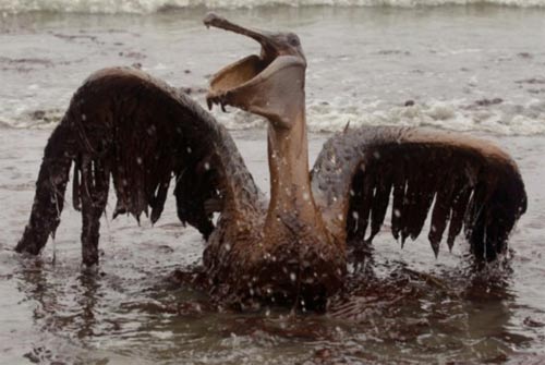 2010年6月3日,路易斯安那海岸東大陸島海灘,一只褐鵜鶘艱難地張開翅膀。
