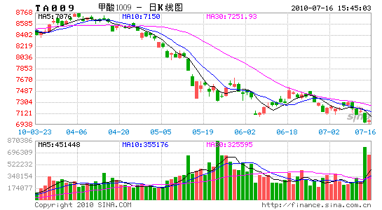 鄭商所主力合約TA1009成震蕩走跌行情,開盤價7294,周初收小陰線,最高7312,最低6938,周四輕松跌破兩個強支撐位,最終收于6986,周跌286點,持倉量227918手,成交量2257242手。