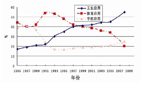 1991-2009年,碳纖維在工業應用領域的消耗是持續增長的,航空航天領域基本保持平衡,而體育用品在碳纖維應用的比例則持續下降,碳纖維應用逐漸從航空航天、體育用品向民用工業應用轉移,特別是隨著大絲束碳纖維的大規模生產,其價格將不斷降低,民用工業用量將繼續保持大幅度增加的趨勢。