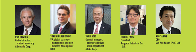圖片從左至右:Ray Dawson :美國(guó)雅保科技全球產(chǎn)品總監(jiān) Soren Hildebrandt:巴斯夫全球戰(zhàn)略運(yùn)營(yíng)副總裁 Shuji HoJio:日本艾迪科公司聚合物添加劑銷售總裁 Jongho Park:韓國(guó)松原總裁 Ryo Sasaki;新加坡 Sun Ace Kakoh 公司總裁
