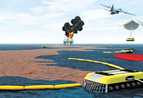 回收泄漏石油的空降機器系統“Aeros”是一支飛機空降的機器人部隊。這些機器人能隔離石油,利用類似離心分離機那樣的油水分離器提煉收集石油。每位機器人能在一分鐘內凈化3000加侖(約11噸)水。這樣一支自動化部隊能在幾天時間里將1100萬加侖(約4萬噸以上)的漏油清潔完畢,總量相當于埃克森·瓦爾迪茲油輪的泄漏油量。