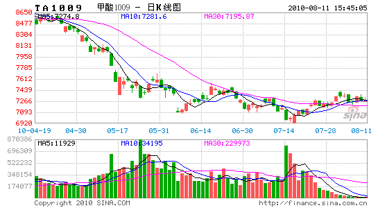 2010年7月,鄭州PTA整體呈現(xiàn)探底回升行情。7月上旬,由于投資者對(duì)美經(jīng)濟(jì)復(fù)蘇的可持續(xù)性和就業(yè)市場(chǎng)前景心存憂慮,以及歐元區(qū)債務(wù)危機(jī)擔(dān)憂重燃,加之國內(nèi)股市暴跌,促使場(chǎng)對(duì)中國經(jīng)濟(jì)增長(zhǎng)憂慮進(jìn)一步加深,鄭州PTA延續(xù)6月末弱勢(shì)盤整走勢(shì),隨后更是于7月12日啟動(dòng)了一輪破位下行行情。主力合約TA1009一度下探6920低點(diǎn),此后,因大連港油管爆炸短暫封港,長(zhǎng)江洪峰迫使重慶封港,導(dǎo)致逸盛石化和蓬威石化原料運(yùn)輸受阻,加之隨后蓬威石化宣布停產(chǎn)的影響,PTA市場(chǎng)供應(yīng)量出現(xiàn)下降預(yù)期,從而助推鄭州PTA呈現(xiàn)強(qiáng)勢(shì)反彈走勢(shì)。7月26日,主力合約移倉至1101合約,市場(chǎng)交投持續(xù)活躍。截至7月30日,主力合約TA1101月開盤7522元/噸,最高7648元,最低7200元/噸,并以7634元/噸收盤價(jià)結(jié)束7月的交易。
