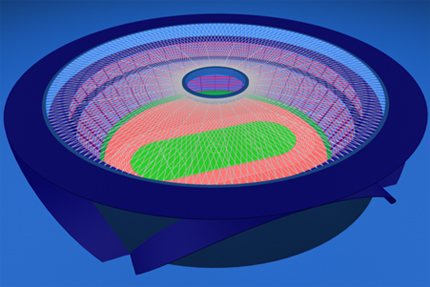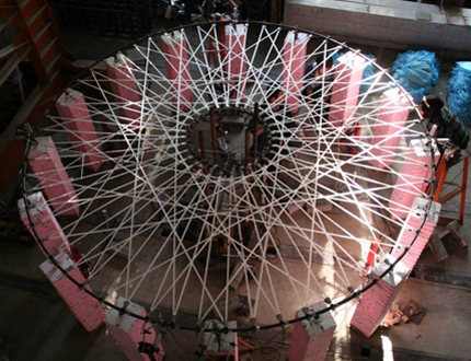 FRP編織網(wǎng)結(jié)構(gòu)由清華大學(xué)研究人員首先提出,該結(jié)構(gòu)體系由內(nèi)外環(huán)梁、編織網(wǎng)面、錨具系統(tǒng)和整體張拉裝置組成,具有很強(qiáng)的可設(shè)計(jì)性。針對不同形狀的環(huán)梁,通過編織設(shè)計(jì),得到不同編織形式的網(wǎng)面,進(jìn)而將不同編織形式的網(wǎng)面進(jìn)行組合,可以得到多層網(wǎng)面、多道張拉等多種形式的編織網(wǎng)結(jié)構(gòu),既保證結(jié)構(gòu)的受力性能,又可以創(chuàng)造出豐富多彩的建筑效果。經(jīng)過一系列的理論分析和試驗(yàn)研究,表明該結(jié)構(gòu)與其他材料的同類型結(jié)構(gòu)相比,具有重量輕、承載力高、設(shè)計(jì)施工方便、可以實(shí)現(xiàn)更大跨度等優(yōu)點(diǎn),跨度可達(dá)400m。同時(shí)針對FRP板條的錨固問題進(jìn)行研究,成功開發(fā)出適用于FRP板條的錨具系統(tǒng),解決了FRP編織網(wǎng)結(jié)構(gòu)中FRP板條錨固的關(guān)鍵問題。