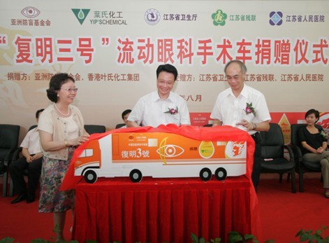 香港知名化工上市公司、全球最大醋酸酯生產商及全國最大化工產品制造商之一-葉氏化工集團有限公司(「葉氏化工」)繼2008年向寧夏回族自治區捐贈第一臺流動眼科手術車后,再次向江蘇省進行了第二臺「復明三號」流動眼科手術車的愛心捐贈,以幫助江蘇省的白內障病人復明,重燃生命之希望!捐贈儀式在江蘇省人民醫院舉行,出席捐贈儀式的嘉賓包括江蘇省人民政府、江蘇省衛生廳、江蘇省殘疾人聯合會、江蘇省人民醫院相關領導、香港葉氏化工集團董事葉子軒先生、董事楊民儉先生及香港亞洲防盲基金會行政總裁陳梁悅明太平紳士。