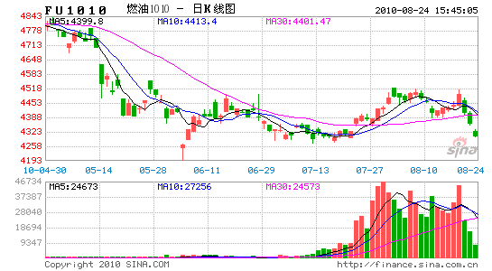 從技術上來看,上周五的一根陰線吞沒了近一周的漲幅。本周一價格續跌,30日均線位臵未能產生任何支撐,預計價格至少將繼續跌向4300一線才能獲得一定支撐。由于國內燃料油前期走勢持續強于國際原油,因此其回調空間也相對較大,短期之內我們維持看空思路。