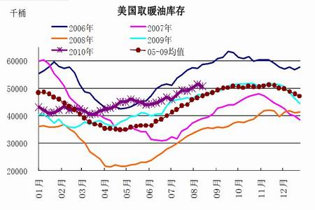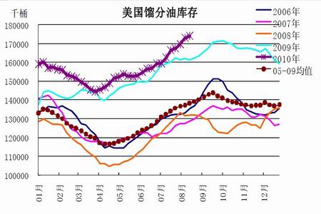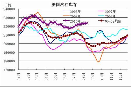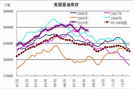 美國原油庫存仍是需要持續關注的重點之一,因其直接體現了美國階段性的原油及石油產品的消費狀況。根據美國最新的庫存報告(2010 年8 月18 日公布)顯示,上周商業石油庫存增至紀錄高位。目前主要的油品庫存均處于非常高的水準,也使得供應過剩的憂慮持續存在。其中,原油庫存遠高于過去5 年平均水平,汽油庫存在近期持續增加,與歷史同期趨勢相背,而餾分油的庫存增速近期則有加快的趨勢。庫存壓力仍將是后期壓制油價上行的主要因素之一,目前我們依然認為80~85 美元/桶是一個強壓力區域。