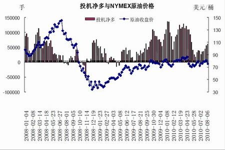 北京時間2010 年8 月13 日周五晚間,美國商品交易委員會(CFTC)公布的數據顯示,截止8 月10 日當周,NYMEX 的原油期貨總持倉為1274605 手,比上次報告增加4 萬手,其中投機多頭略增,空頭減倉,投機凈多頭連續5 周增加,這也體現了近期市場對于油價普遍偏多的思路,但近日油價受供應過剩以及經濟復蘇放緩的憂慮打壓而較多下滑。總體來說,油價仍未能擺脫寬幅震蕩走勢,在70~75 美元/桶這個區域內,投機資金再次入場推高油價的可能性很大,我們依然認為油價的下跌空間已經很有限。