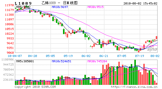 本周合約發生移倉之后,合約1009由于主力資金的撤出表現上漲乏力,而合約1101依舊表現上漲態勢。后市期價有可能繼續維持上漲態勢:1)股市在隨后有可能繼續上漲,從而帶動化工品繼續走強;2)原油價格有可能再次沖擊80美元,刺激化工品的走強;3)上游原料乙烯和石腦油價格止跌企穩,對于期價的支撐作用再次凸顯;4)石化企業在月底連續性上調掛牌價,并且對于8月份掛牌價也大幅上漲,石化企業對于后市行情依舊看好,5)石化企業的限量供給以及裝置的檢修,對于貿易商心態繼續刺激好轉;5)后市需求好轉預期繼續增強,農膜備貨,節假日包裝材料的需求等刺激期價上漲。