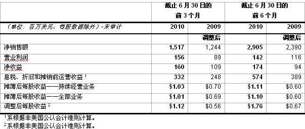 2010年第二季度調整后每股收益為1.12美元,而上年同期為0.56美元。本季度調整后每股收益計算所使用的有效稅率和攤薄股權數量分別為20%和1.584億股。2010年第二季度的息稅、折舊和攤銷前運營收益為3.32億美元,而去年同期為2.48億美元。調整后每股收益及息稅、折舊和攤銷前運營收益不含300萬美元來自其他費用和其他調整項的凈利潤。