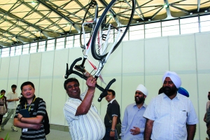 8月25日,江蘇連云港神鷹自行車(chē)有限責(zé)任公司年產(chǎn)一百萬(wàn)輛碳纖維自行車(chē)項(xiàng)目用地正式簽約,這標(biāo)志著國(guó)產(chǎn)碳纖維自行車(chē)將實(shí)現(xiàn)批量生產(chǎn)。據(jù)了解,該項(xiàng)目占地面積八百五十畝,總投資二十億元,總建設(shè)期為五年。連云港神鷹自行車(chē)公司是目前國(guó)內(nèi)首家采用擁有自主知識(shí)產(chǎn)權(quán)碳纖維原料規(guī)模化生產(chǎn)自行車(chē)的企業(yè)。據(jù)了解,這種碳纖維自行車(chē)已通過(guò)歐洲碳纖維自行車(chē)質(zhì)量認(rèn)證標(biāo)準(zhǔn),價(jià)格僅為進(jìn)口同類(lèi)碳纖維自行車(chē)的三分之一,質(zhì)量也僅是傳統(tǒng)自行車(chē)的三分之一。圖為外國(guó)客商用一只手很輕易地舉起碳纖維自行車(chē)的情景。