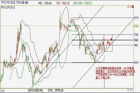 從技術分析角度看,PVC 上行態勢已定,從波浪理論看,經過一浪的上升及調整9月份有望進入2 浪的上升及調整階段。另從布林帶分析PVC 仍處于中軌上方運行,中期震蕩上行態勢不變。