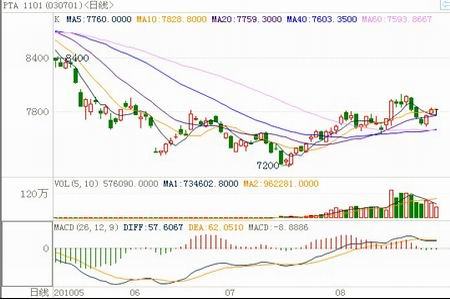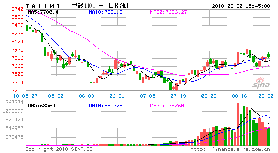 8月份,PTA裝置陸續(xù)停工檢修,市場供應(yīng)有所偏緊,PTA期貨呈現(xiàn)高位震蕩的走勢,中旬以來隨著資金的積極介入,一度上沖至8000元關(guān)口;但國際原油價格的持續(xù)走低也使得PTA止步8000關(guān)口出現(xiàn)回落,圍繞7800展開整理。