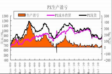 經過2009年PX產能的集中釋放之后,PX價格上漲的空間已明顯縮小。目前市場預估2010年國內PX產能將達到近1000萬噸,對市場仍將是巨大的壓力。但是,從PX廠商生產盈虧情況來看,近期生產廠商的利潤一直徘徊在50美元/噸之下,甚至有時還出現過虧本的情況。從這個角度看,即使原油價格下滑,PX價格下跌的空間也不會很大。預計8月份PX價格維持在950美元下方的可能性很大,據此價格測算,PTA的生產成本在6250元/噸一下, 對PTA的成本支撐依舊不足,PTA生產商利潤仍位于1000元/噸上方,恐將限制PTA的反彈空間。