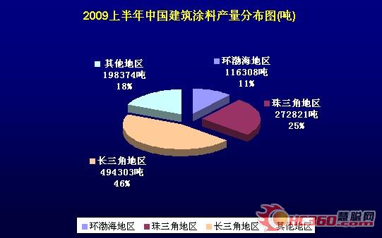 2009年上半年我國建筑涂料產量達108.18萬噸。其中珠三角地區(湖南、廣東、福建)建筑涂料產量27.28萬噸,占全國建筑涂料總產量的25%;長三角地區(上海、江蘇、浙江、山東)建筑涂料產量49.43萬噸,占全國建筑涂料總產量的46%;環渤海地區(北京、天津、河北、遼寧)建筑涂料產量11.63萬噸,占全國建筑涂料總產量的11%;及我國其他地區建筑涂料產量19.83萬噸,占全國建筑涂料總產量的18%。