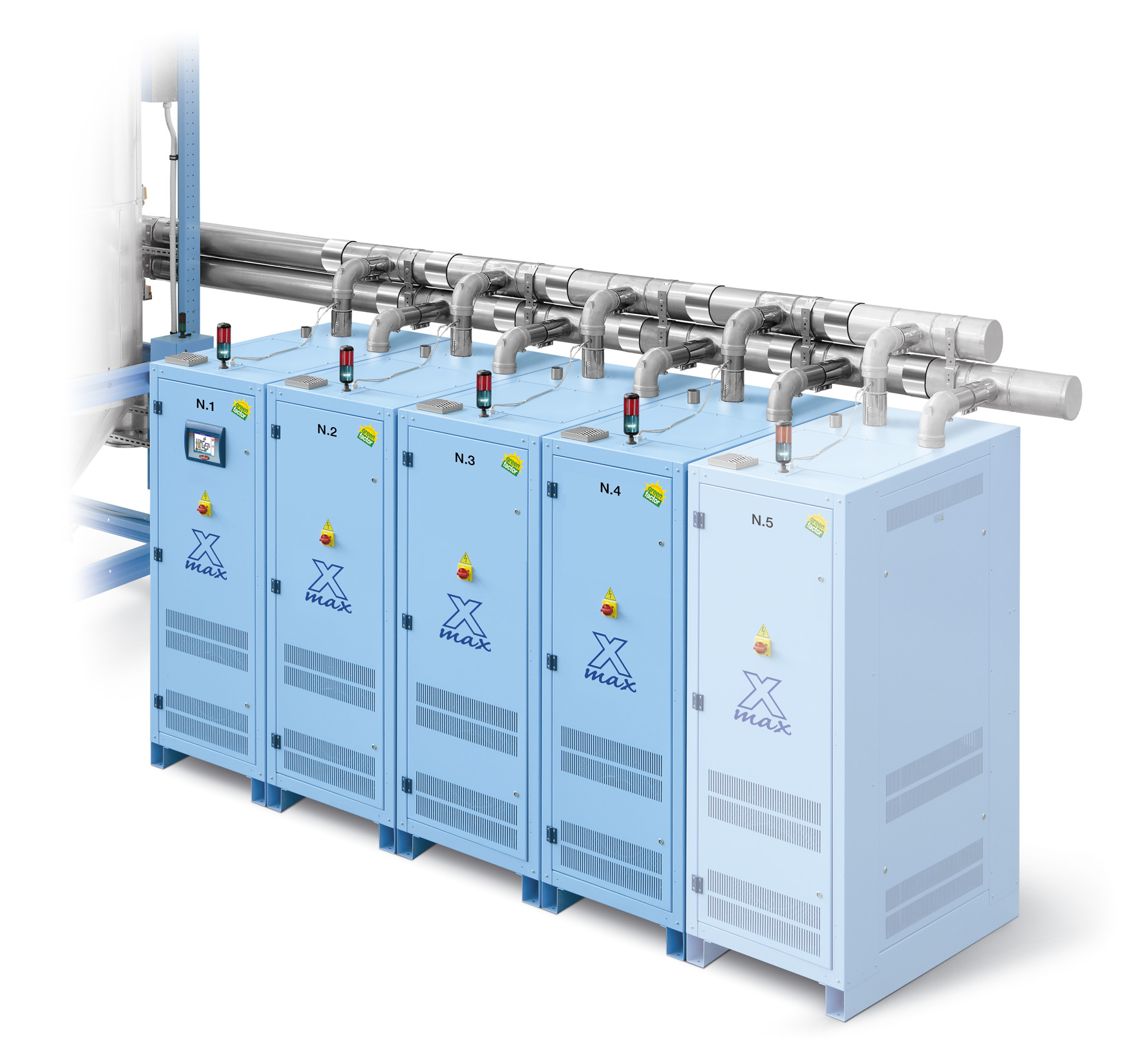 The basis for the new MORETTO EUREKA project – designed to reduce energy consumption consistently and improve performance and quality – is the new multiple unit X MAX system (X MAX dryers combined with the FLOWMATIK controller and the state-of-the-art OTX hoppers), with its single desiccant bed, i.e. twice the size of conventional beds. Reduced energy consumption is achieved by the use of zeolite, a volcanic mineral, as a molecular filter. The air flow channel of the X MAX dryer is situated in the centre with the heater in the middle of the channel. With the heat exchanger also at the centre, complete recovery of regenerated energy is assured, as every Watt of energy is used in the polymer treatment.