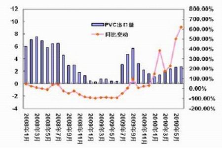 2010 年6 月中國PVC 粉樹脂出口量為2.77 萬噸,均價為966.46 美元/噸,比上月數量增長3.13%,和去年同期相比增長618.01%。