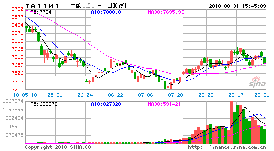2010年8月初,鄭州PTA整體延續7月下旬以來走勢,呈現震蕩盤整走勢,但交易區間較之前有所上移。8月16日,在PTA現貨內外盤雙雙上漲,加之8月份中旬后數套PTA生產裝置計劃檢修啟動,PTA庫存壓力較大的局面顯現明顯改觀預期,此外,傳統秋冬紡織服裝產銷旺季的隨后來臨等利好因素推動下,鄭州PTA一舉突破前期旗形整理區間,快速拉升并伴隨著持倉與成交的雙雙巨幅放量,當日收盤較前一交易日暴漲近3.7%并完成有效突破。此后,市場呈現震蕩盤整格局,截止8月20日,主力合約TA1101月開盤7666元/噸,期間最高7994元/噸,最低7560元/噸,月收盤7828元/噸。