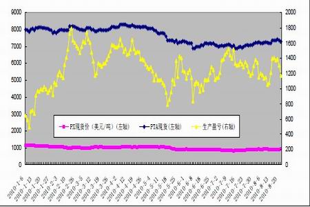 圖為PTA 與PX 現(xiàn)貨價(jià)格及PTA 生產(chǎn)盈虧走勢(shì)圖。(圖片來(lái)源:北京中期)