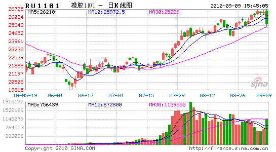 8月份,天然橡膠市場持續在高位震蕩,尤其是月初價格在“雙節”備貨預期氣氛炒作下,價格一路上竄至25000點高位,隨后持續接近維持了半個月之久的橫盤整理格局,并且借助東南亞進口膠市場價格走強以及外盤市場走強的雙重利好作用下,有效突破至25800點,臨近4月份高點;而整個月底行情,應該來說市場是“欲跌還漲”的行情,突破之后,部分多頭資金獲利了結,迅速上演了一波連跌“1000”余點行情,正當投資者紛紛猜摸回調在即的同時,多頭資金的持倉卻在穩定增長,并且日膠市場也同步突破前期阻力位不斷創下新高,9月初,天然橡膠突破重要阻力關口“26000”點,一波由基本面堅挺與資金炒作雙重作用下推動的“軟商品”走強行情正在延續。