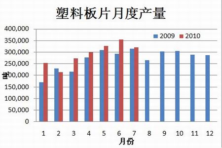 7月份,我國塑料制品產量較6月份有明顯下降。7月份天氣炎熱,房地產業出現淡季,下游型材生產也出現季節性回落。其中7月份板片材生產僅有32萬噸,同比僅增長0.45%,而環比更下降為9.23%。而塑料條棒環比下降幅度達到10.38%。這與我們前期的判斷相一致。