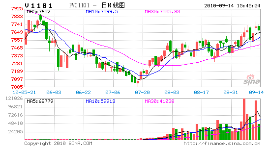 PVC期貨周初大幅上漲,周四跟隨商品市場下跌,周五再度反彈。主力合約V1101開于7490,盤中最高7730,最低7450,尾盤報收于7645,上漲160點,漲幅2.14%,成交量增加20.0手至35.8萬手,持倉量增加13048手至51244手。