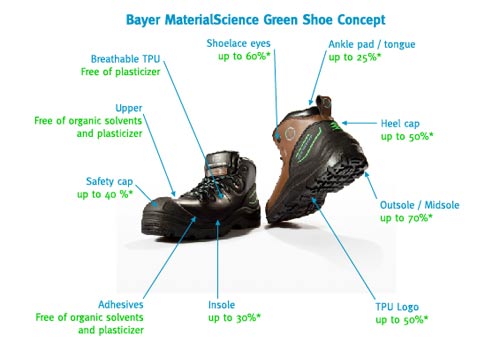 拜耳材料科技研發出了一項獨特的“綠色環保概念鞋”——使用各種環境友好型材料和技術,其中包括基于天然可再生原料制成的聚氨酯、無溶劑聚氨酯涂料和膠粘劑原料、聚碳酸酯共混物以及由天然可再生原料制成的熱塑性聚氨酯(TPU)。“Ecotrekker”概念鞋中高達90%的材料采用拜耳公司的環境友好型產品制成。