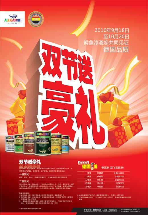 日前,涂料行業高端品牌鱷魚漆即將在全國范圍內開展“鱷魚漆邀您共同見證德國品質——雙節送‘豪’禮”大型活動,幸運者更可親赴德國,參觀奔馳、西門子、鱷魚漆總部等知名德國企業,感受頂級國際品質。活動時間為2010年9月18日至10月20日。為了讓更多的消費者感受國際品質,鱷魚漆還在線上同時舉辦“效果改變中國”裝修評選活動,有機會贏取萬元大獎和國際大師的裝修指點。詳情請瀏覽鱷魚漆活動網站xiaoguo.alligator.cn