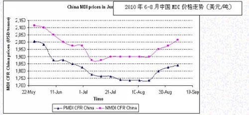 在強勁需求支撐中國MDI價格上漲的同時,亞洲地區(qū)其它國家,尤其在印度等東南亞地區(qū),漲價并未達(dá)到如期水平。跟隨中國市場的強勁上漲,印度MDI價格小幅攀升,9月8日商談在1800-1850美元/噸CIF,一些成交價在更高水平。