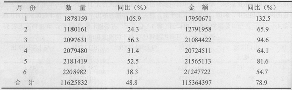 有機顏料的進口也同樣出現了較大幅度的增長,而且增長的幅度比染料大。根據我國海關統計,今鈕1~6月份有機顏料進口11625832噸,比去年同期提高了48.8%;用匯1.2億美元,同比增加78.9%。詳細況和逐月進口情況見下表: