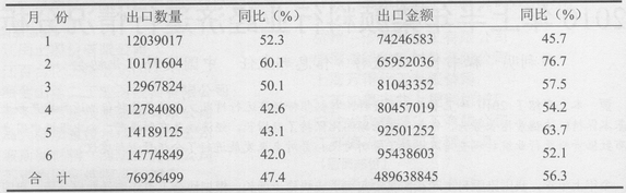 今年上半年,有機顏料的出口同比高于染料增長幅度。1~6月份全國有機顏料完成出口7.7萬噸,同比增加47.4%;有機顏料出口創匯完成近5億美元,同比增加56.3%。上半年有機顏料出口量、出口創匯環比和染料的趨勢一樣,基本保持小幅增長勢頭。詳細情況和逐月完成情況見下表: