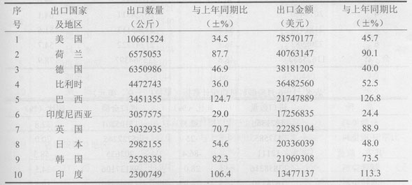 2010年1~6月有機顏料進口前十名的國家