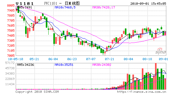 繼7月下旬大幅反彈后,8月份PVC期貨維持高位震蕩格局。本月主力合約V1101開于7440,盤中最高7580,最低7295,尾盤報收于7515,上漲85點,漲幅1.14%,成交量大幅增加53.4萬手至58.9萬手,持倉量增加29416手至41292手。