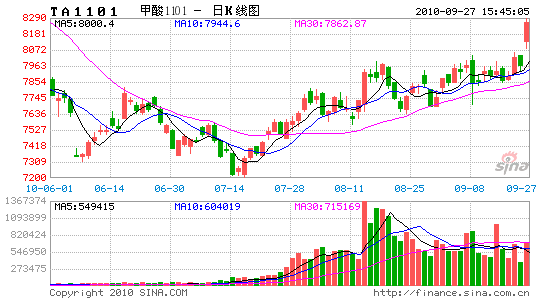 9月份,受國(guó)內(nèi)A股振蕩整理、PX延續(xù)反彈、PTA檢修裝置重啟、聚酯產(chǎn)業(yè)鏈旺季消費(fèi)預(yù)期以及江浙減排限電等多重因素影響,鄭州PTA延續(xù)區(qū)間震蕩的走勢(shì),1101合約波動(dòng)在7600-8000之間。下旬,受到主流供應(yīng)商上調(diào)9月合同貨結(jié)價(jià),PTA1101合約突破并站上8000關(guān)口,高點(diǎn)觸及8200一線。
