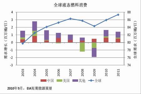 EIA 維持原油需求預(yù)期不變:在9 月份公布的月度報(bào)告中,EIA 預(yù)計(jì)全球原油需求在2010 年將比去年增加160 萬桶/日,這與上次報(bào)告的預(yù)測一致,需求的增加主要集中在OECD 以外的國家,尤其是中國、中東、巴西等地區(qū)。EIA 預(yù)測2011 年全球原油需求將增長140 萬桶/日,這比上次報(bào)告輕微下調(diào),理由是因?yàn)镚DP 增長率將不及預(yù)期,EIA 認(rèn)為第四季度WTI 原油的均價(jià)將達(dá)到77 美元/桶,2011 年的均價(jià)將達(dá)到82 美元/桶,這比上次報(bào)告有所下調(diào)。EIA 預(yù)計(jì)后期全球石油庫存將逐步減少為油價(jià)提供支撐,油價(jià)將隨著經(jīng)濟(jì)的復(fù)蘇而緩慢上升。
