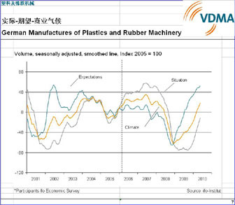 經營狀況和前景有利。由于塑料和橡膠機械制造業景氣指數急劇上升,所以重返上升勢頭。德國機械的需求量在所有銷售地區都急劇增大。業界對2010年下半年所有客戶地區訂單的發展趨持樂觀態度。抱怨訂單量不足的公司的數量下減少了三分之二,而且在2009上半年開始實施的多次裁員,到2010年上半年大幅減少。