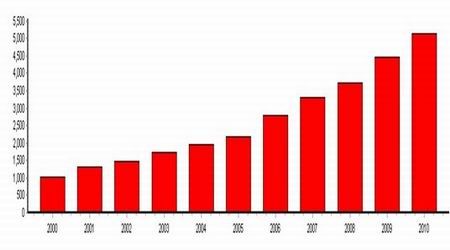 2010年11月份,塑料制品當(dāng)月產(chǎn)量536.06萬噸,當(dāng)年累計5145.67萬噸,不論是單月產(chǎn)量還是年度累計產(chǎn)量,都創(chuàng)下了歷史新高。自2000年以來,每年塑料制品都保持在10%以上的增產(chǎn)速度,2010年的前11個月漲幅較去年同期更是達(dá)到了20%的增長幅度。