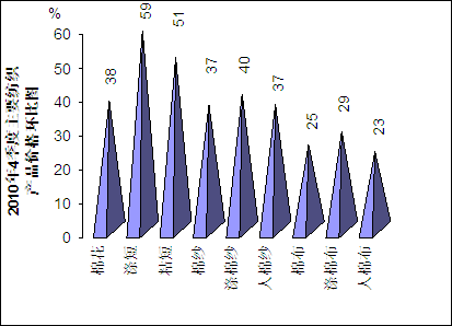 不但與2009年同比價格漲幅巨大,而且2010年4季度與3季度環比,主要紡織產品價格也提高明顯,均在20%以上,特別是滌綸短纖和粘膠短纖價格提高都在50%以上(如圖)。