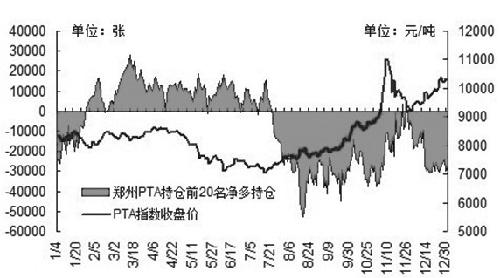 2010年1月下旬至7月中旬,鄭州PTA持倉前20名總體保持在凈多狀態,PTA指數價格振蕩下行;自7月下旬至2010年年末,持倉前20名 總體保持在凈空狀態,PTA指數價格上行。一多一空,前后兩個階段可謂是涇渭分明。但讓投資者心生疑惑的是,為什么PTA價格走勢和主力持倉方向呈現相反 狀態?資金方向不再是價格走勢的風向標?