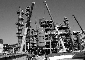 九月三十日,大慶石化公司大乙烯工程單套進口設備中體積最大的設備——辛烯醛轉化器順利就位。辛烯醛轉化器長十二點八米,寬五點五米,高五點二五米,重一百零八噸,屬超長超寬超重特種設備,該設備的吊裝就位,標志著大乙烯丁辛醇項目又一重要節點順利完成。圖為技術人員正在吊裝丁辛醇裝置辛烯醛轉化器。
