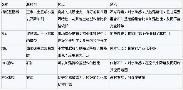 下表為主要的生物降解塑料性能的比較: