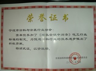 在全國涂料和顏料標準化年會上,由于寧波市涂料與涂裝行業協會參加《環氧云鐵中間漆》化工行業標準的制定,獲得“全國涂料和顏料標準化技術委員會”頒發的榮譽證書。與寧波涂協一起參加行業標準的飛輪和大達、裕隆等公司也獲得證書和表彰。