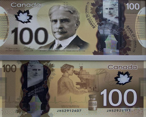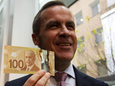 這是。當日,加拿大央行宣布首次開始發行塑料鈔票。這次進入流通的塑料鈔票面值為100加元,以特別聚合物制成,具有易辨識、難假造等特點,預計使用壽命是普通紙幣的2.5倍。加拿大央行還表示,其他面值分別為50、20、10及5元的塑料鈔票將在2013年底前陸續投入流通。