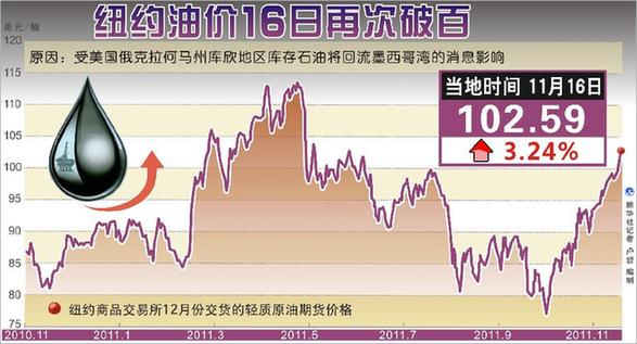 受美國俄克拉何馬州庫欣地區庫存石油將回流墨西哥灣的消息影響,紐約油價16日大漲,收盤價自6月9日以來首次重破每桶100美元。