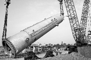 十一月八日,武漢石化煉油二期工程一百八十萬噸加氫裂化裝置中最重的設備,直徑四米、高十九米、總質量六百二十七噸的加氫精制反應器R6101順利安裝就位,標志著該工程大型設備安裝拉開序幕。圖為吊裝加氫精制反應器R6101的場景。