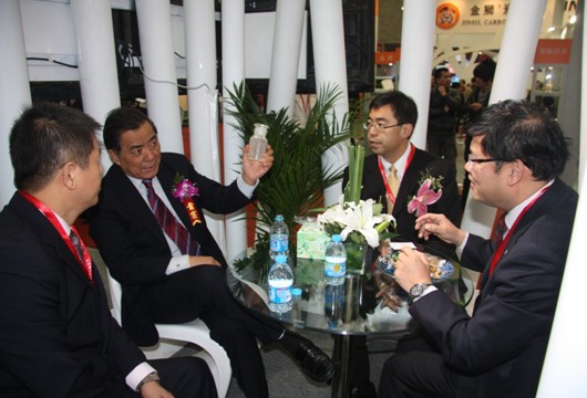 圖為中國石油和化學工業聯合會會長李勇武蒞臨展位,希望江蘇圣奧要繼續發揚優勢,做好做強橡膠防老劑。