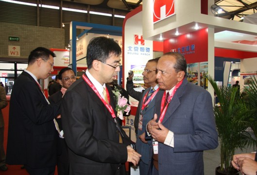 圖:展會期間,公司CEO蔡崢琦與印度客人正在進行工作交流。